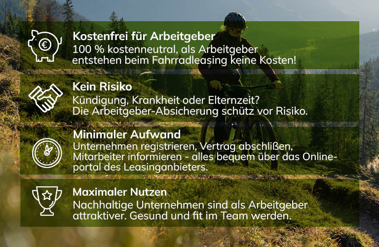 Fahrradleasing ist perfekt für Arbeitgeber, die mit einem innovativen Benefit Mitarbeiter binden möchten. Es überzeugt bei der Mitarbeitersuche, da Arbeitnehmer bis zu 40 % der Kosten sparen. Der Aufwand für Arbeitgeber ist gering und sie sind bei Mitarbeiterausfällen vollständig abgesichert.